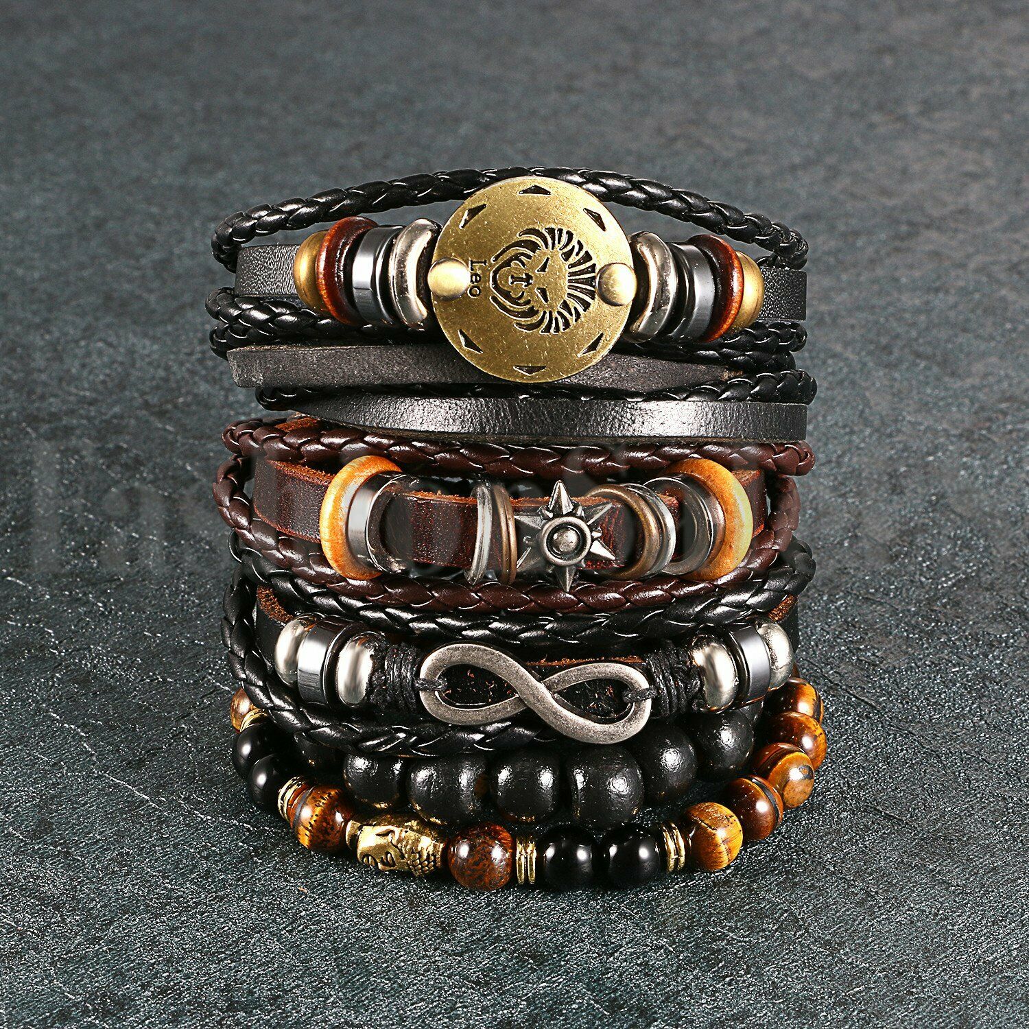 6pcs Black Brown Tribal Leather Beaded Cuff Wristband Bracelet for Men Women Set