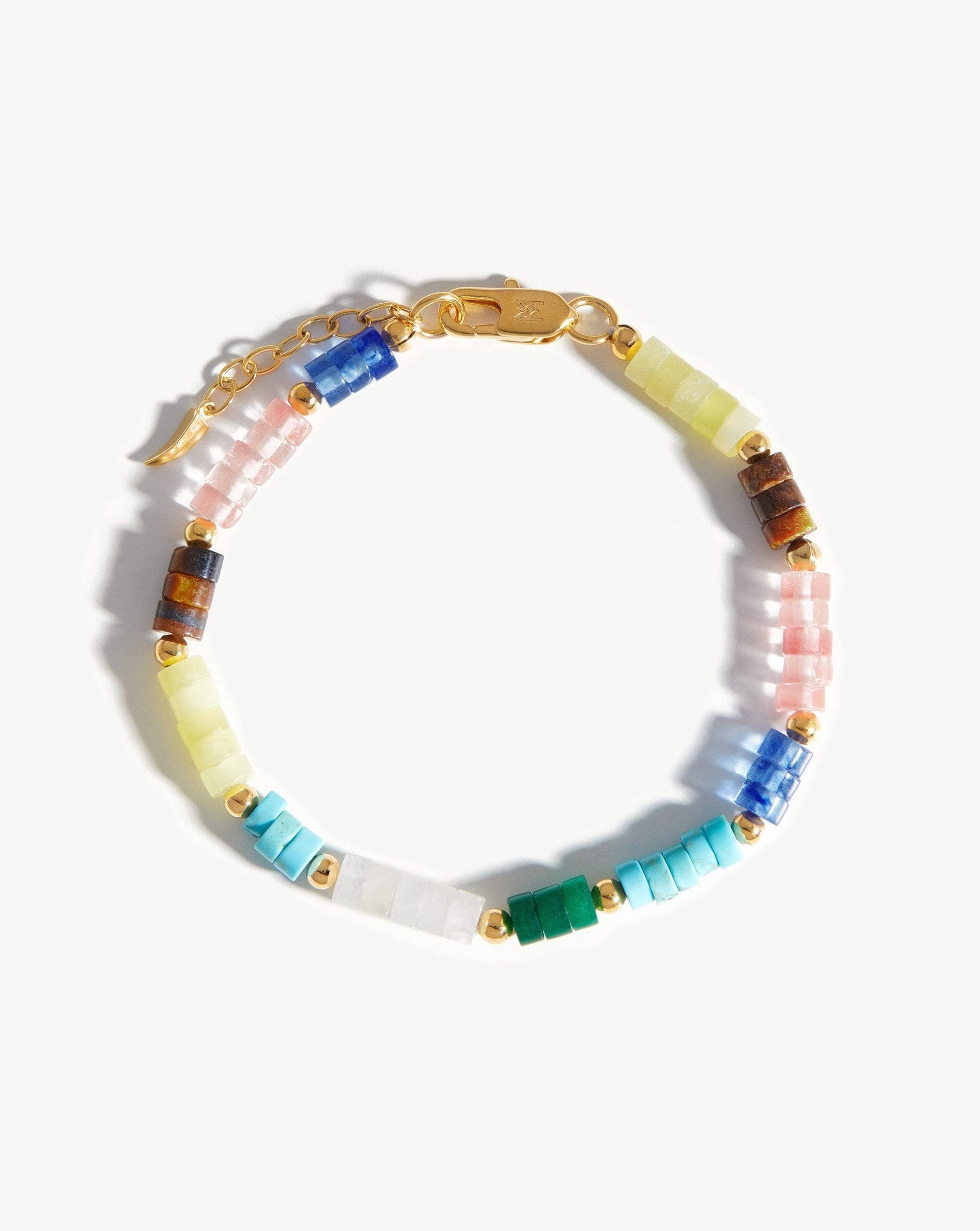 A kaleidoscope of colour to express yourself with. This bracelet features a vibrant mix of multi-coloured stones that are contrasted and offset with small gold beads for a distinctive finish. Wear solo, layer with more beaded styles or stack with one of our signature chunky chains.