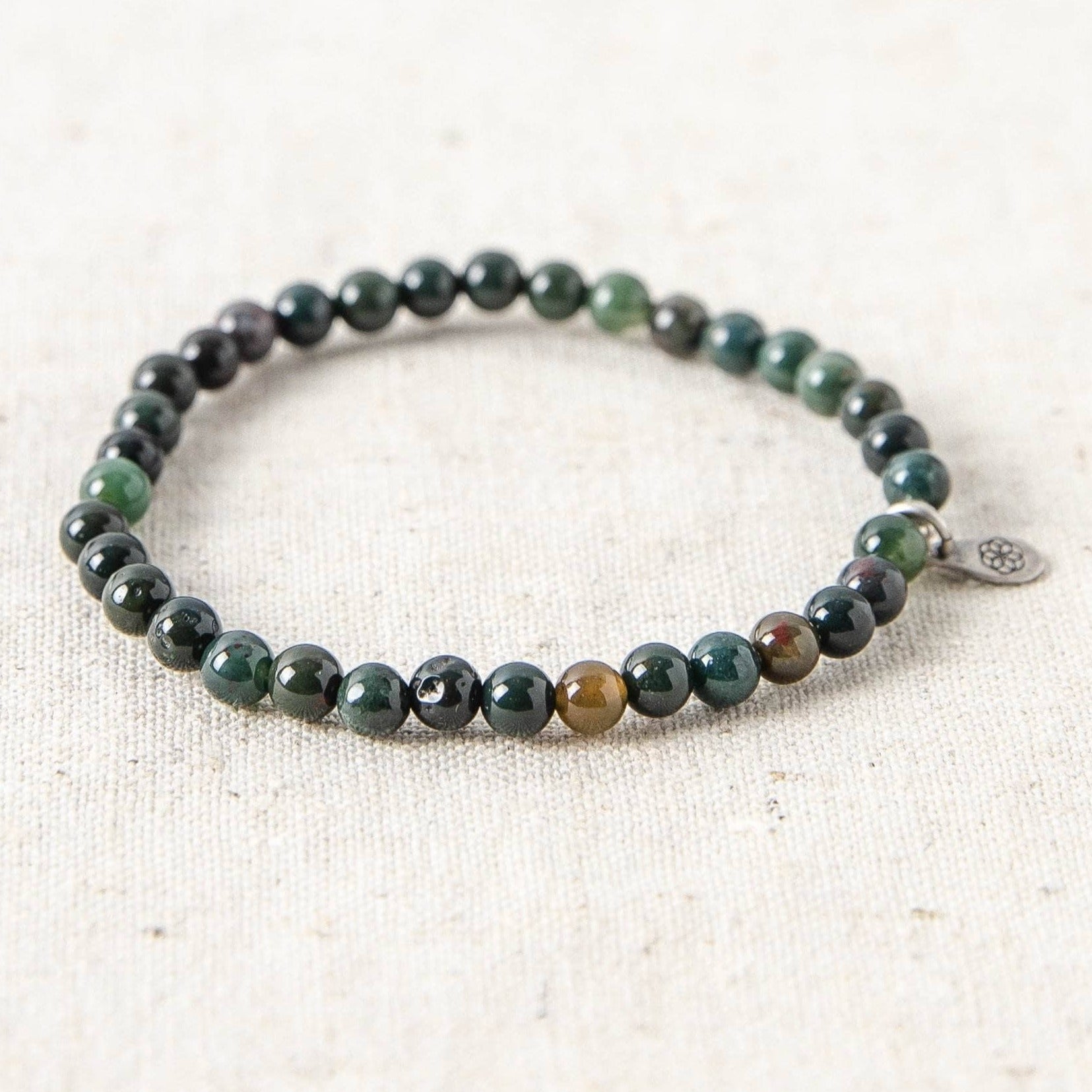 The simmering colors of earthly green and dark red merge in this Bloodstone Energy Bracelet. This is a stone that burns bright with energy. When you are feeling a slump, Bloodstone gets your blood moving, encouraging healthy circulation and using its healing properties to regenerate cells and tissue so you can rise again.