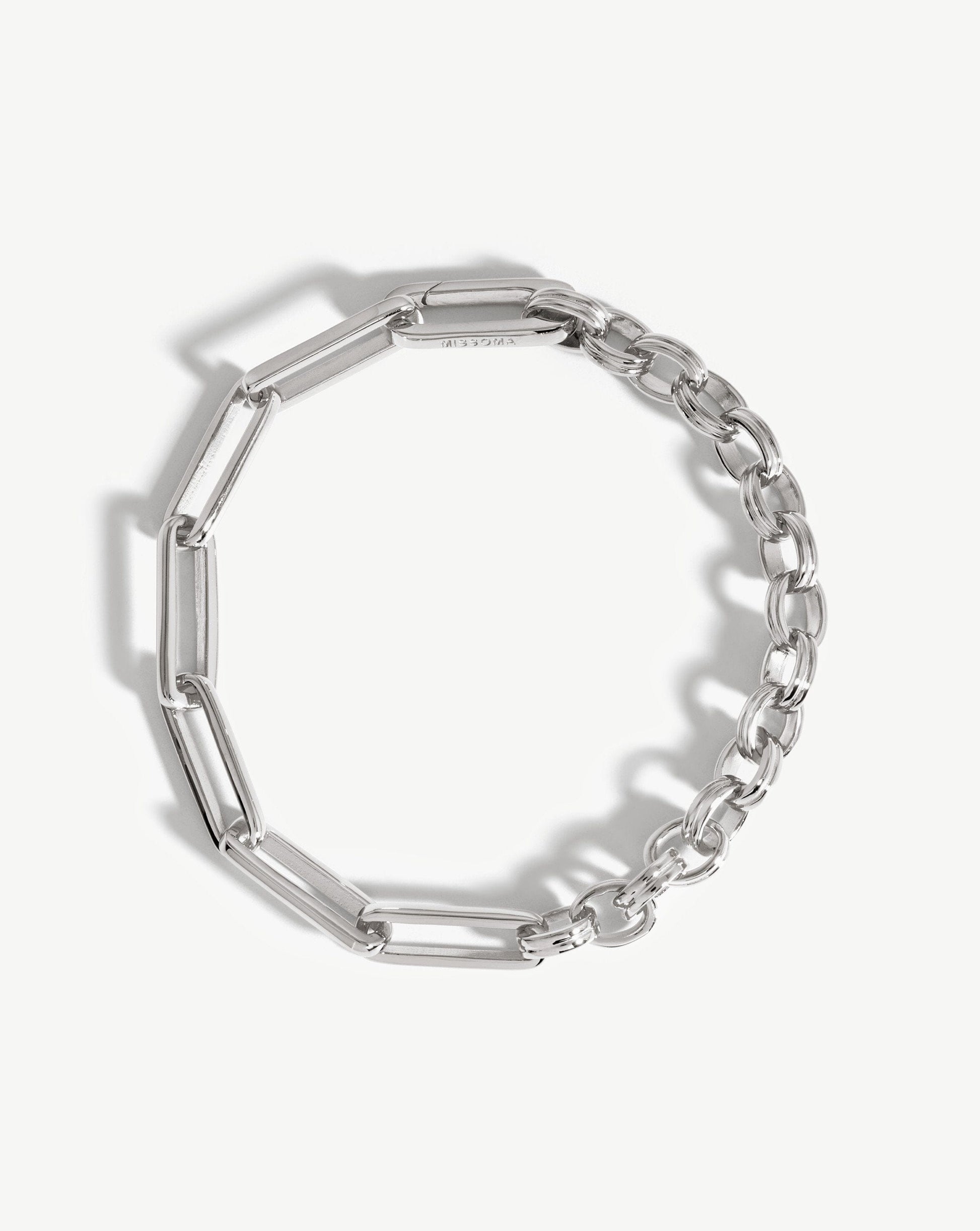 A new take on a classic, plus an update of our best selling Axiom bracelet. Each distinctive link in this chain is designed and cast by hand, a bold piece to wear solo. This piece features a hidden clasp for a seamless finish. Add to your arm stack or customise with detachable clip-on pendants.