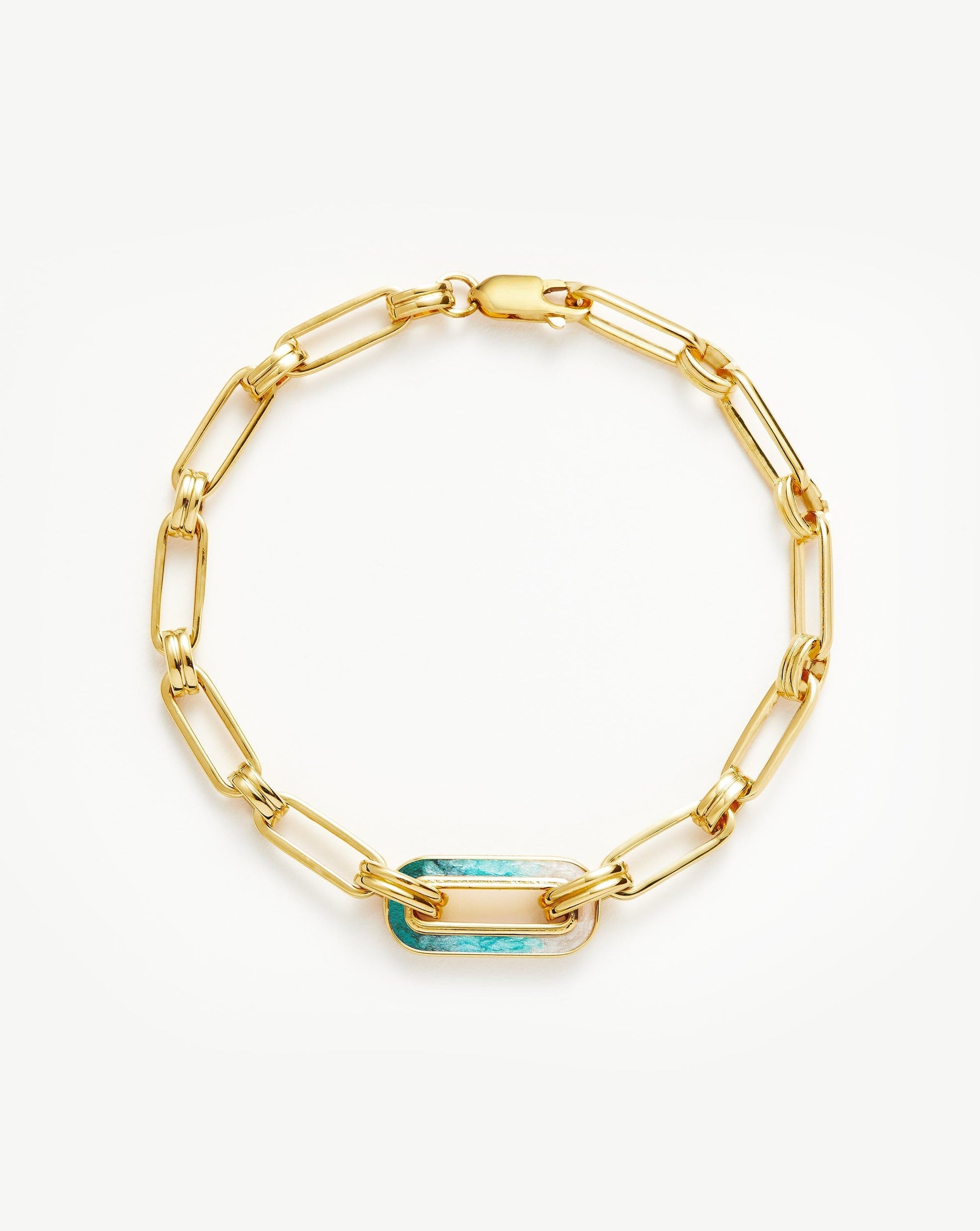 Bring colour into your arm stack. This paperclip chain bracelet, inspired by our best selling Aegis design, features an ombré floating pendant — a spectrum of luminescent white, aqua, and teal enamel. Stack with even more chains for maximum impact.