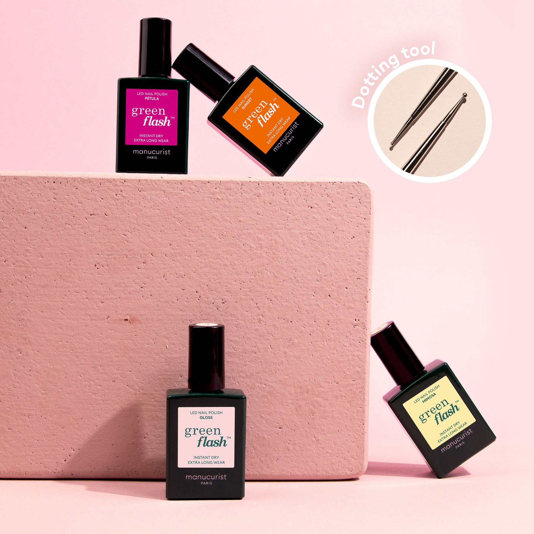 Brushes at the ready! This set contains all the products you need to create the popular springtime nail art in our Yucatàn collection: 4 Green Flash? or Green colors (Pétula, Gloss, Sunset, Mimosa) + 1 double-ended Dotting Tool.