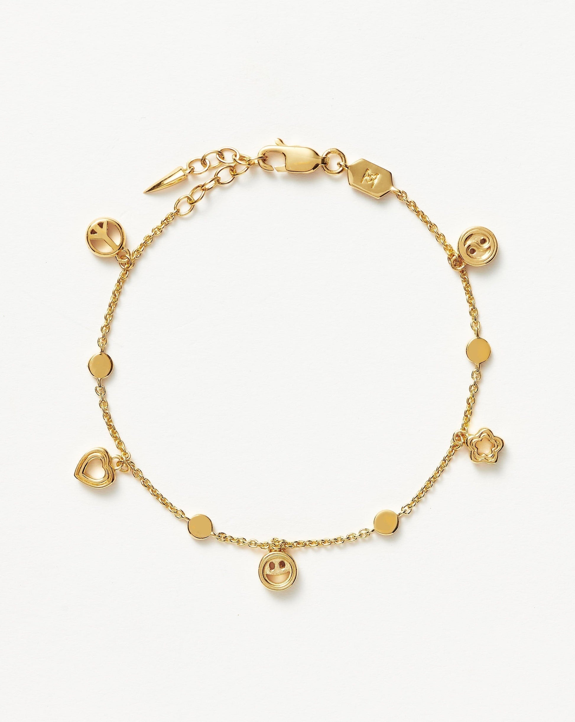 Good vibes all round. Evenly spaced charms – flowers, happy faces, hearts and peace symbols – bring a retro-inspired addition to your arm stack. The delicate satellite chain bracelet is offset with round discs. Stack with chunky chains and beaded bracelets for minimalist styling.