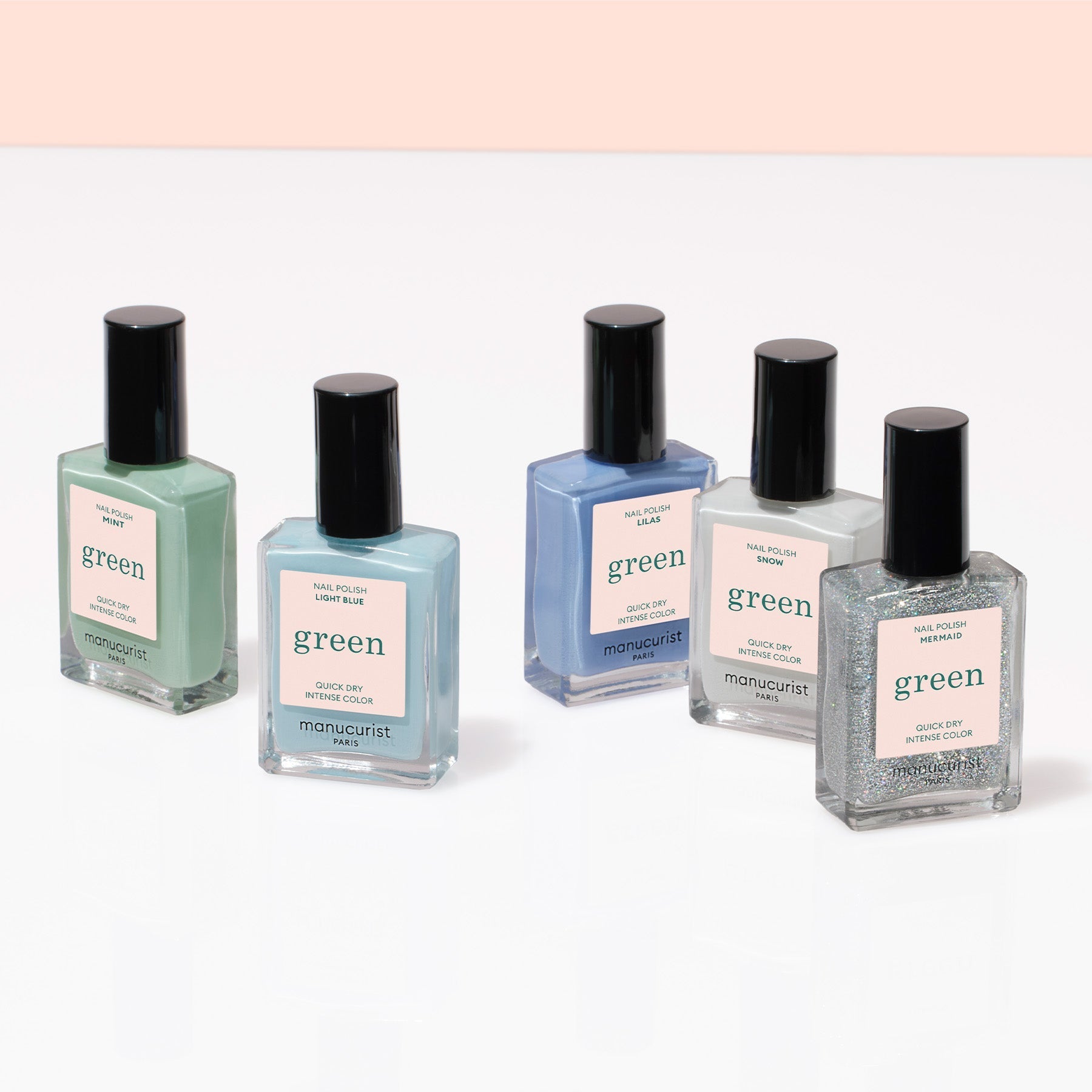 A rainbow of 5 limited-edition Green? nail polishes for spring/summer 2024! Sparkling shells and the waves soothing melody , answer the siren’s call and escape with this collection of hypnotic aquatic shades.