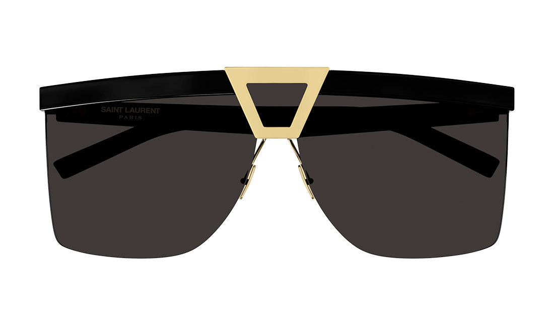 Distinctive and empowering, this new Saint Laurent oversize mask perfeclty recalls the "glamorous toughness" of the Maison's muse Paloma Picasso. A front plastic bar, enriched by a geometric metal detail in galvanic colors, is fused with full acetate temples.