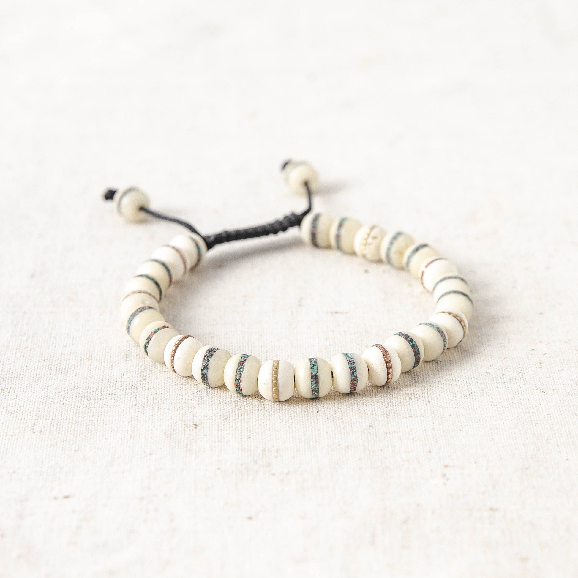 The Tibetan Mystic Bracelet is beautifully made, calling on the bones of the domestic population that died from natural causes, this mala bracelet invites you to celebrate the life cycle of the long-haired yak, to breathe in the cleansing energy of the Himalayas and the mythology of Central Asia, and to encourage healthy blood circulation along with the cooling elements of prayer and meditation.
