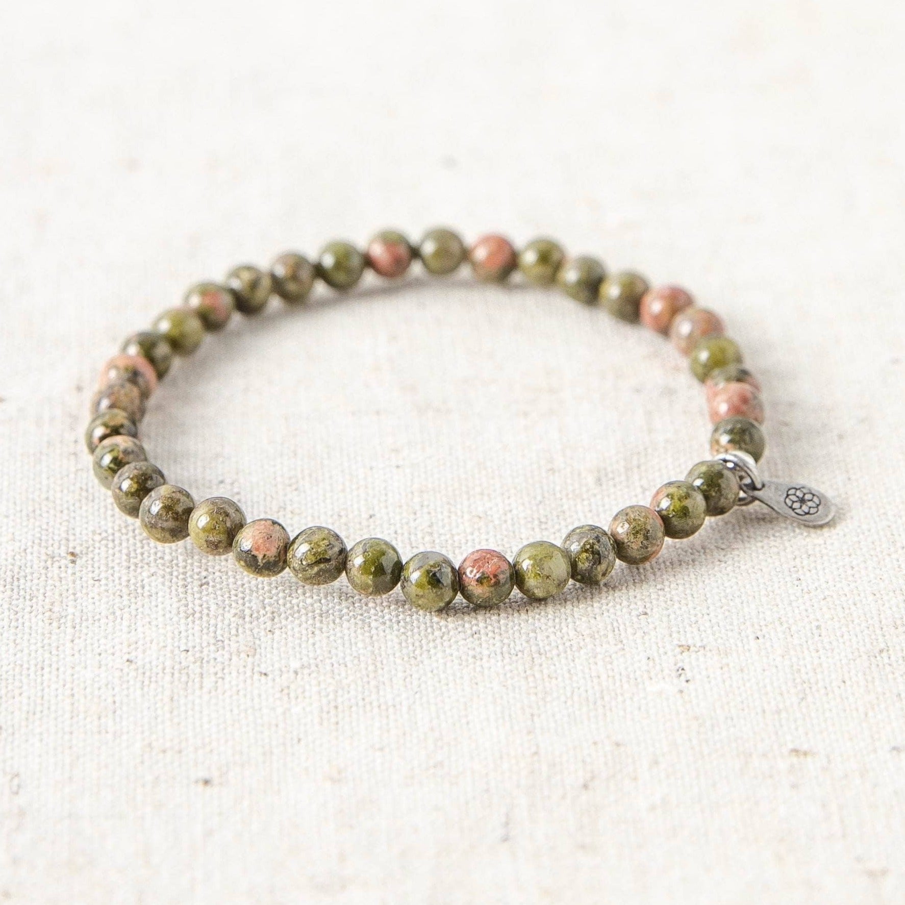 An all-American stone, hailing from the Unaka Mountains, the Unakite Energy Bracelet ripples with tree-greens and cloudy pinks, bringing with it all the love, compassion, and glorious grounding we can find from nature’s majestic mountains.