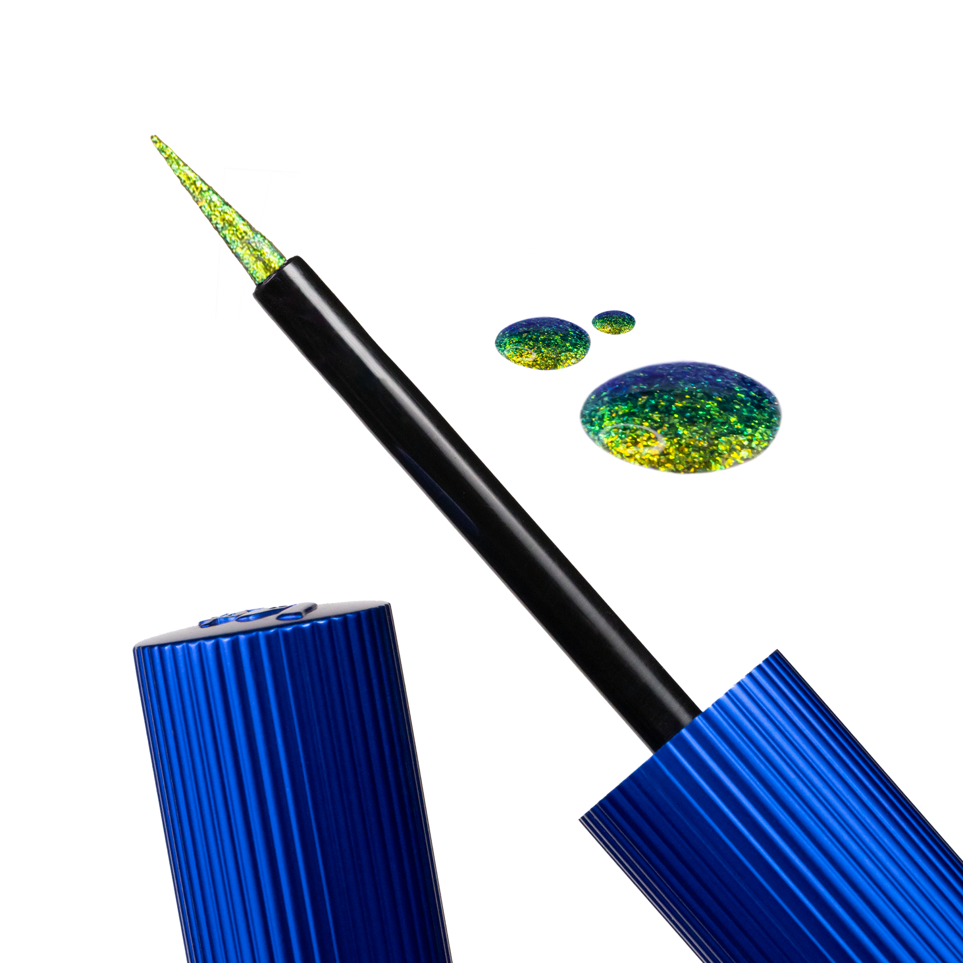 A multichrome liquid eyeliner with an intense color shift from gold to green and blue boasts a buildable formula that dries quickly to a shiny multichrome finish. Designed for all-day staying power with long-lasting shine without transferring or smudging.