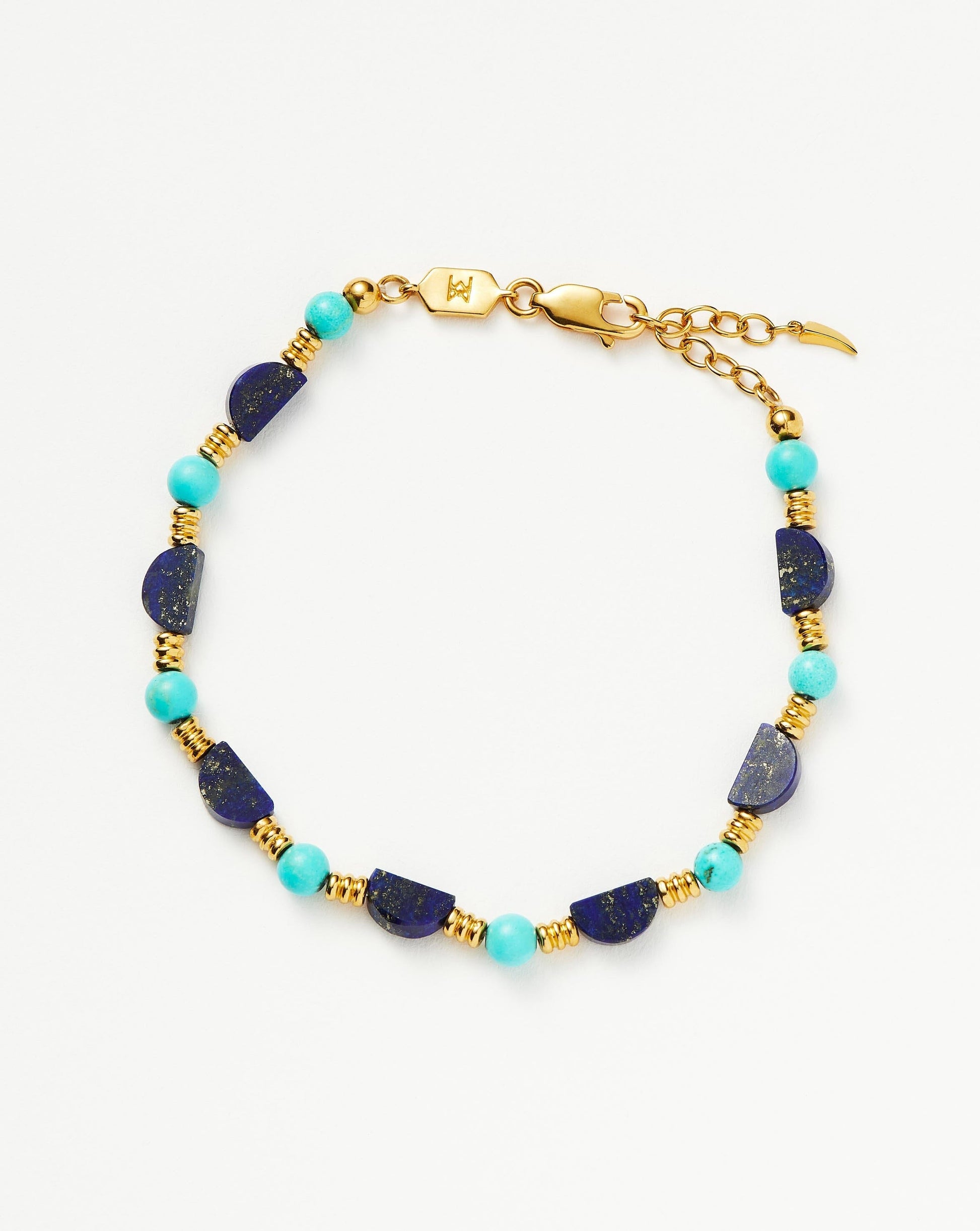 Inspired by our original best selling Zenyu collection. This everyday stacking bracelet features hand-cut lapis half moon shaped charms and round turquoise gemstone beads — known for courage and calming — offset by ridged gold beads for a striking contrast. Stack with even more beaded bracelets or pair with a Zenyu Gemstone Beaded Choker.